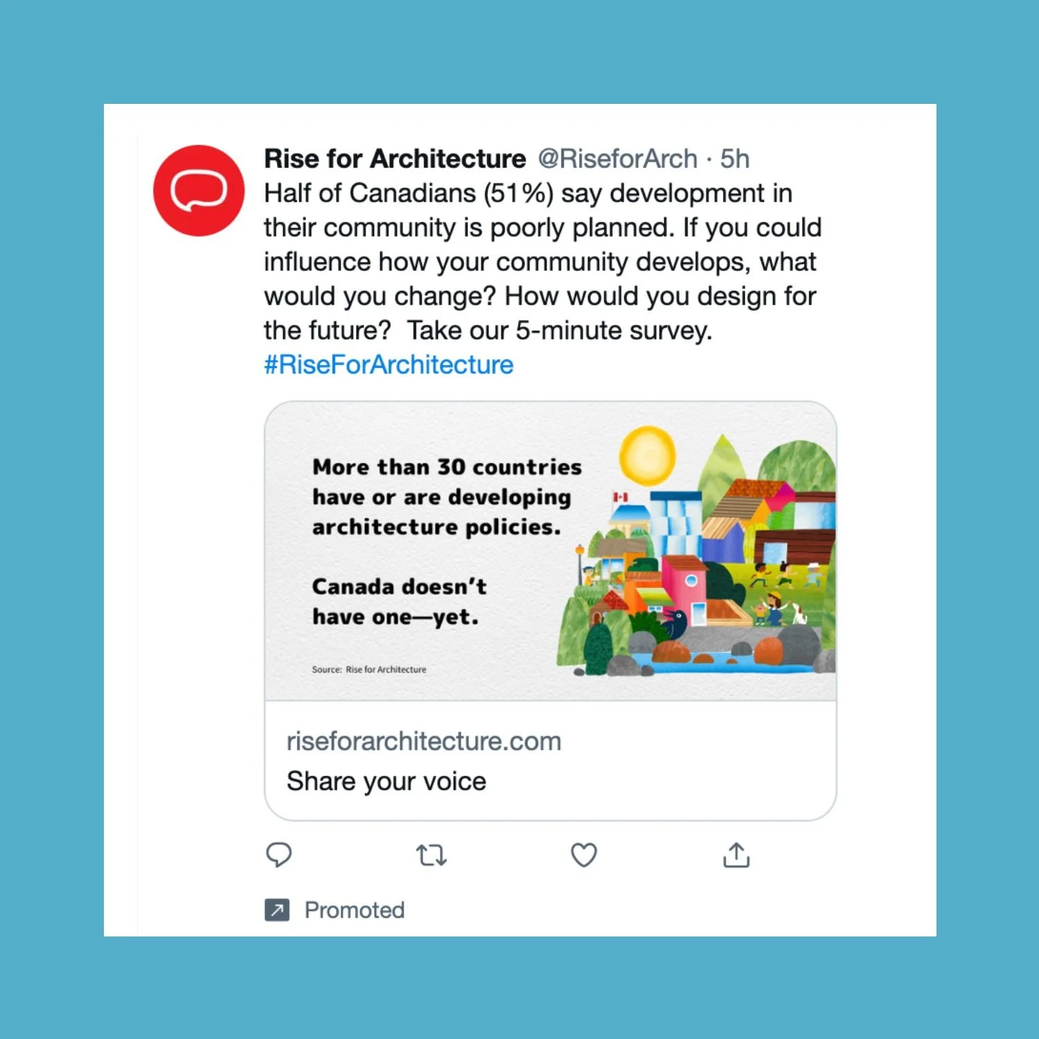 To empower designers asking the same big questions, we shared research and resources collected across the campaign on the Regulatory Organisation of Architects in Canada’s (ROAC) website. These include independent research on the effectiveness of architecture policies and a document with links to European architecture policies, Canadian policies, and design tools for reconciliation. They act as catalysts to empower the building sectors, educators, and governments to create inclusive, sustainable and inspiring communities for all Canadians.