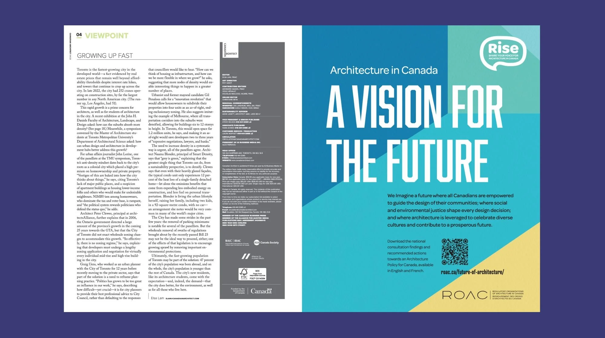 After three years of engagement with students, professionals, and the public, Rise issued a report on the Future of Architecture in Canada: A Vision for the Future. With a goal of reaching every architect in the country, we developed a campaign postcard and full-page ad in Canadian Architect, a free publication issued to architects from coast to coast.